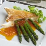 Skær butterdejssnitterne igennem og anret aspargesene i dem sammen med ørredrognssaucen. Pynt evt. med lidt grønt