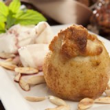 Skræl æblerne, og stik kernehuset ud. Bland kanel og sukker og rul æblerne her i. Sæt æblerne i et smurt ovnfast fad og fyld dem med marcipanfyldet og pensl dem med smeltet smør. Bag dem i ovnen på 180 grader i ca. en halv time. Mandlerne ristes på en tør pande til de er gyldne. Sæt isen i køleskabet en halv time før den skal bruges. Anret æblerne sammen med isen og stænk portvin på. Drys mandlerne på.